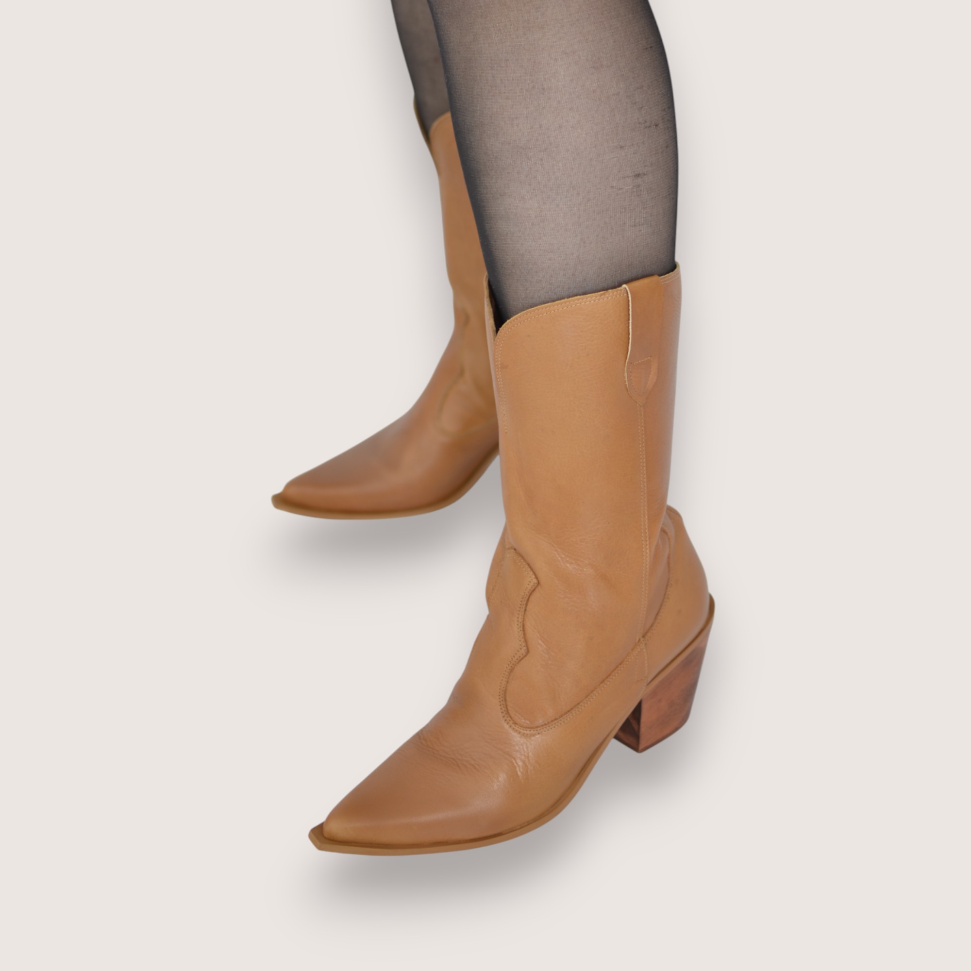 Bota western feminina em couro legítimo na cor caramelo, com bico levemente fino e salto médio de 7cm  que proporciona estabilidade e conforto. O acabamento liso e a modelagem clássica  com um toque elegante e versátil, ideal para compor looks do dia a dia ou produções mais ousadas.