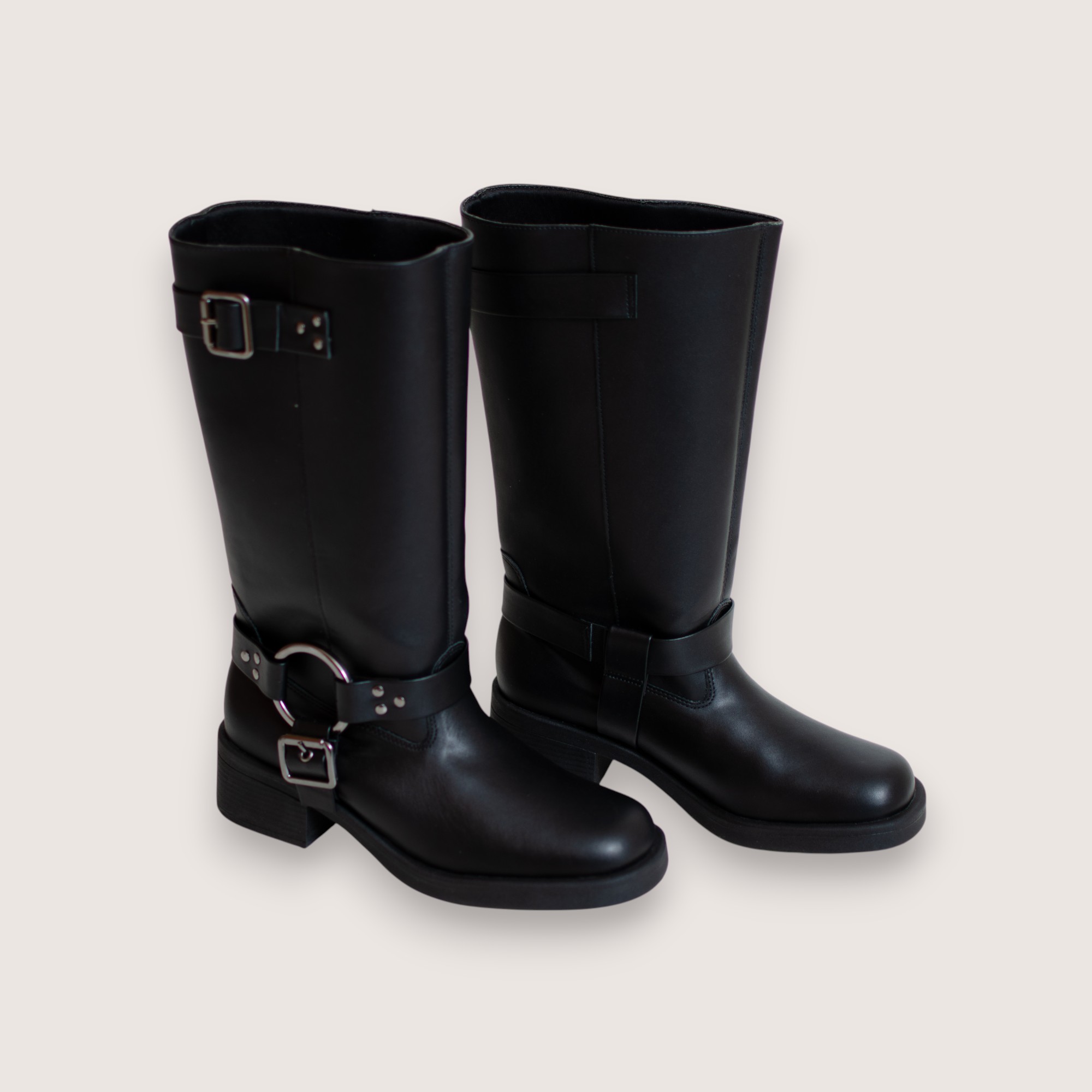 Bota em couro sintético na cor preta, com design e detalhes marcantes que reforçam uma pegada urbana e cheia de atitude. O modelo possui fivelas decorativas na lateral e tiras com aplicação metálica, conferindo um visual moderno e estiloso. Seu cano médio proporciona maior proteção e conforto, ideal para dias mais frios.