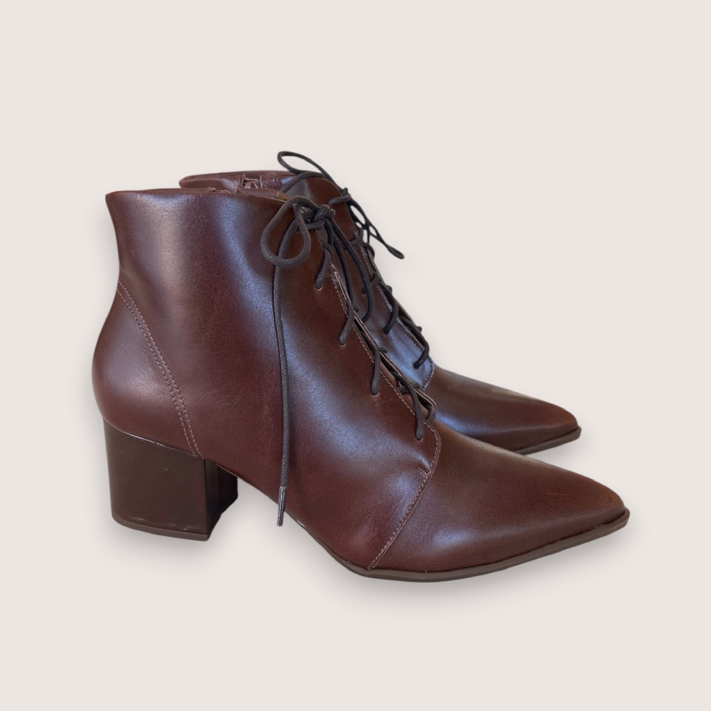 Bota em couro pinhão com acabamento liso e elegante, de cano curto e design moderno. Possui fechamento por amarração frontal, aliado ao zíper lateral que facilita o calce.