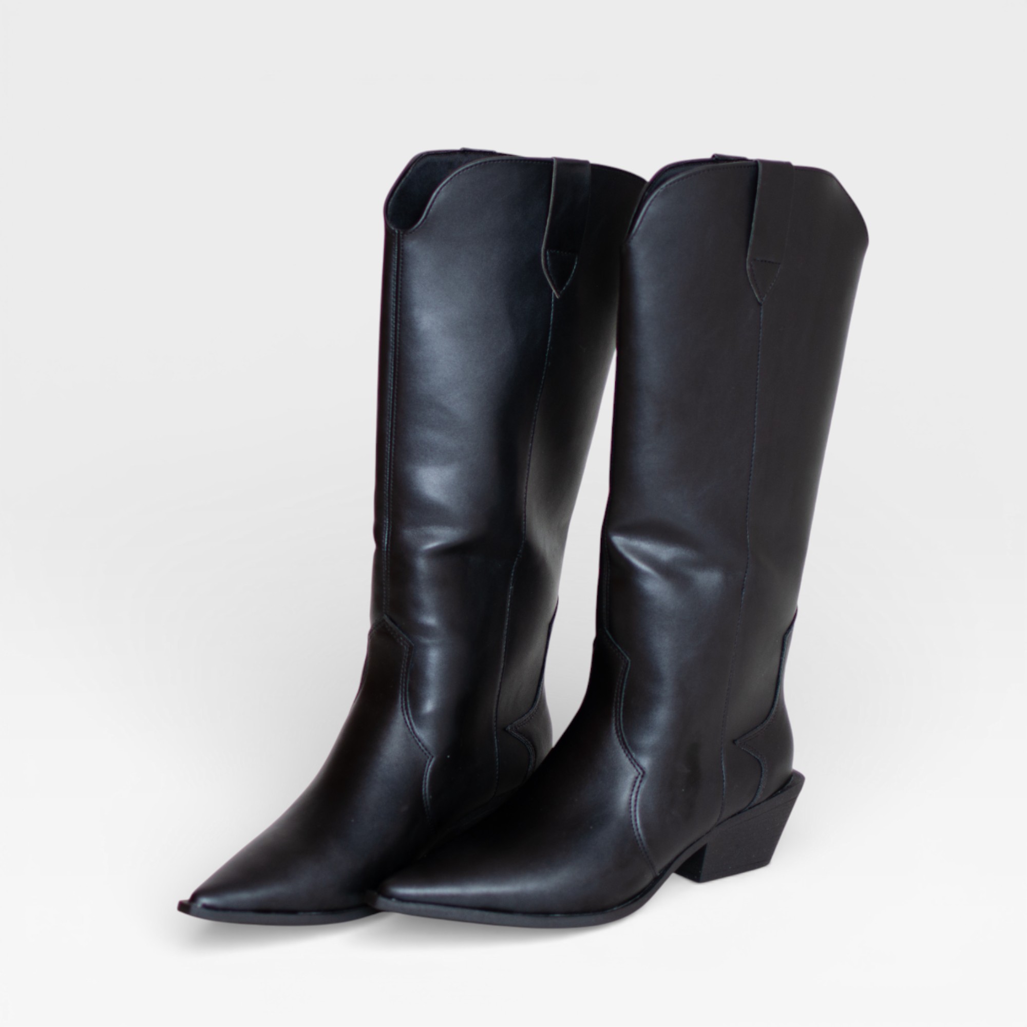 Bota  de cano alto confeccionada em couro sintético , com inspiração western que traz charme e estilo ao visual. Possui bico fino alongado, recortes típicos do estilo country e salto baixo levemente inclinado, que garante conforto e elegância. Versátil e atemporal, ela é uma excelente escolha para o dia a dia ou produções mais fashionista