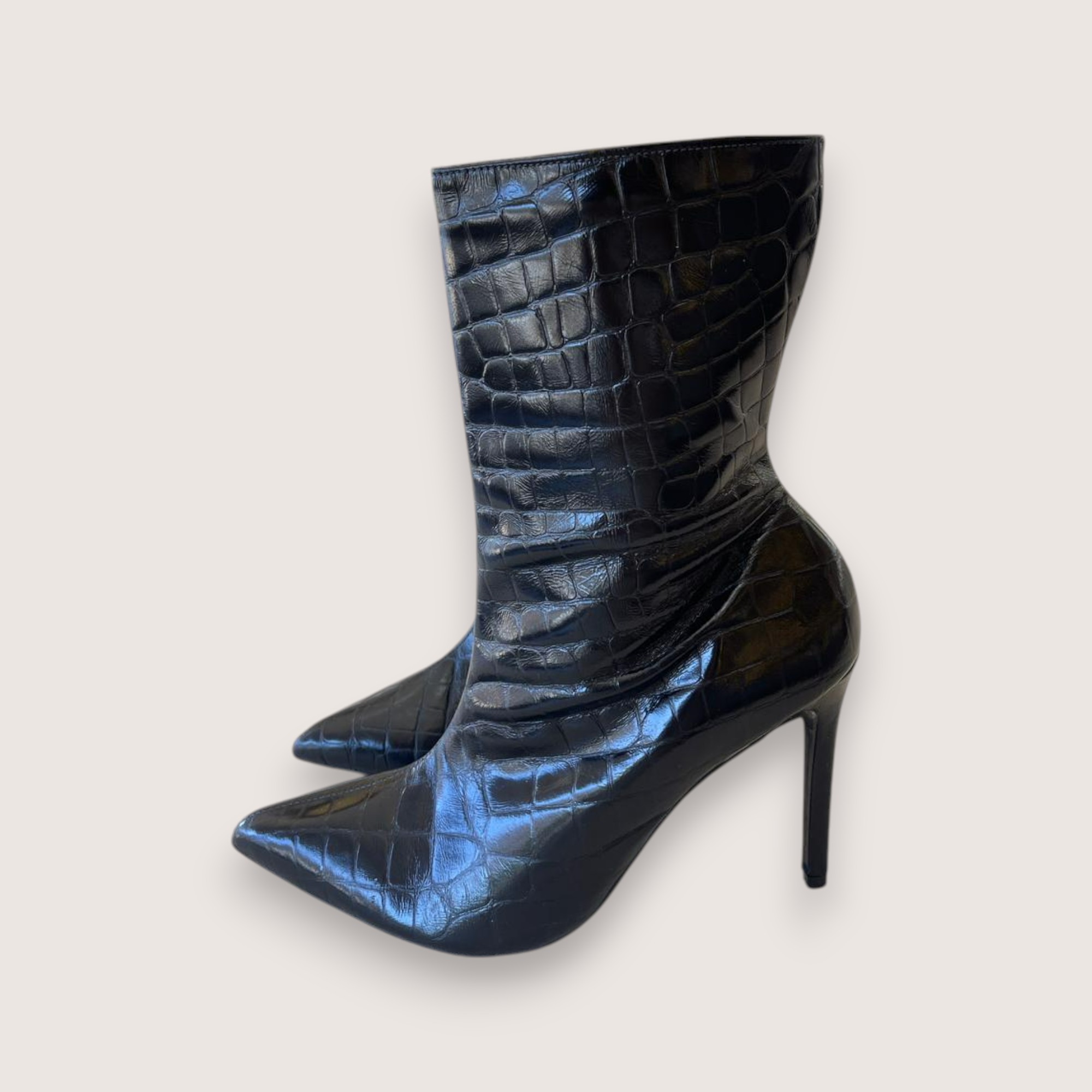 Bota de cano médio confeccionada em material sintético com textura croco na cor preta. O modelo apresenta bico fino e salto fino alto de 10 cm , que conferem um visual sofisticado e moderno. Versátil e marcante, essa bota é perfeita para quem busca um calçado impactante e cheio de charme.