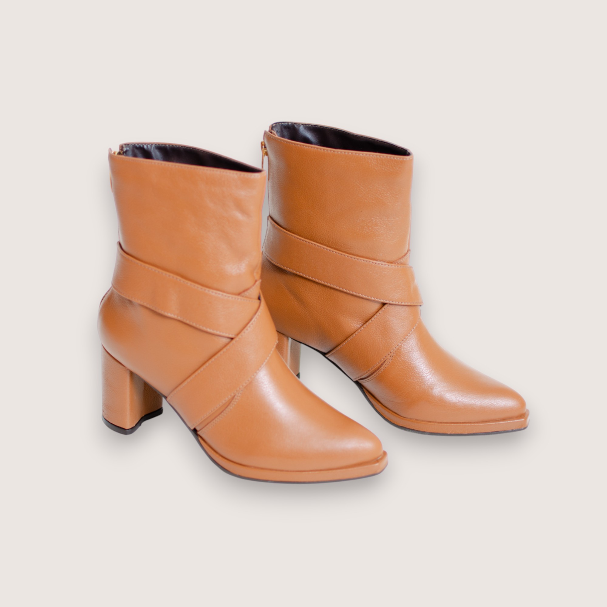 Bota de cano médio em couro na cor caramelo. Conta com detalhe no cano e salto grosso médio de 7cm,  que garante estabilidade e conforto. Moderna e versátil, é ideal para looks do dia a dia com um toque elegante.