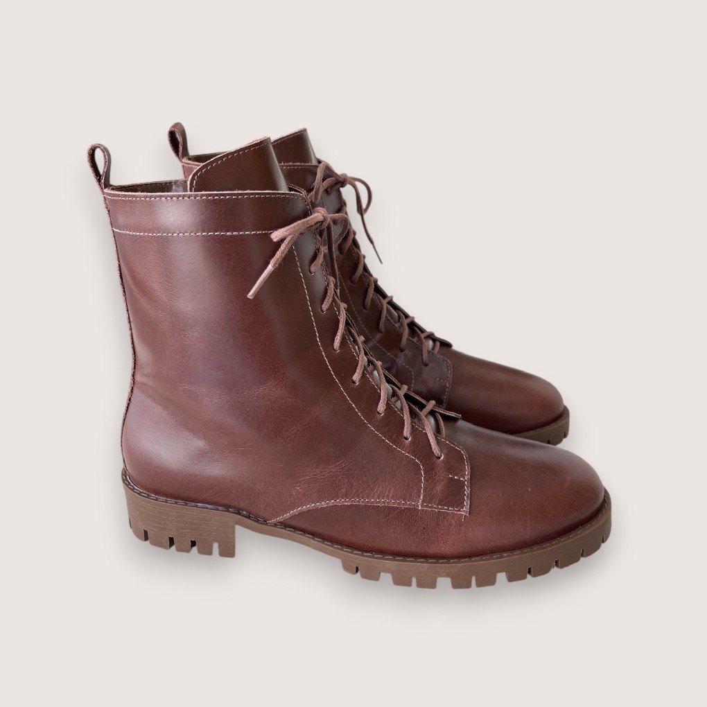 Coturno em couro marrom com acabamento levemente brilhoso, de cano médio e fechamento por cadarço frontal no mesmo tom. Possui bico arredondado, costuras aparentes e zíper lateral que facilita o calce.