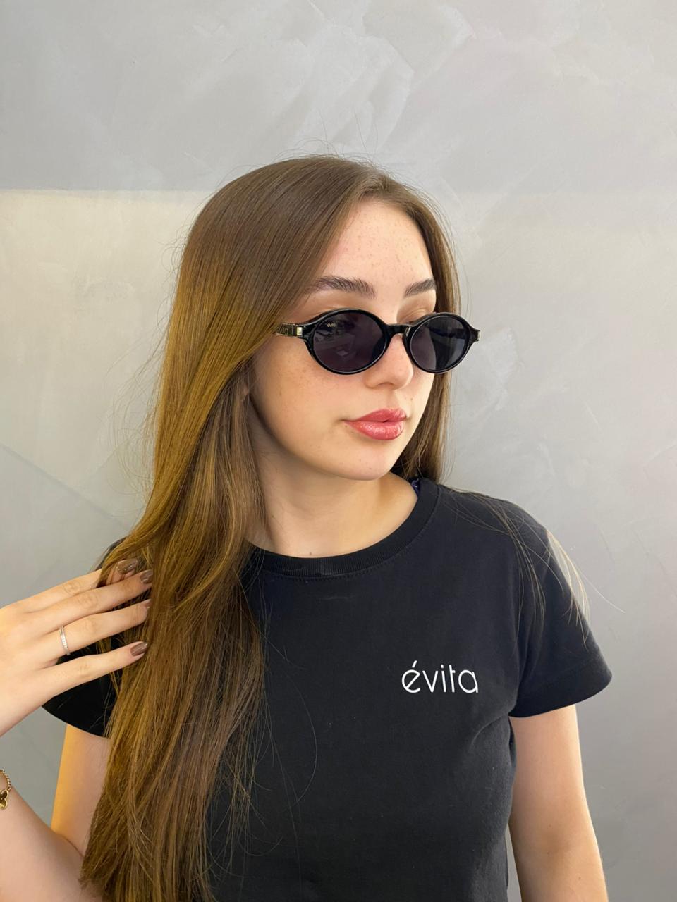 Minimalista e sofisticado, esse óculos solar possui armação preta com design oval compacto, perfeito para quem ama um estilo moderno com toque retrô.