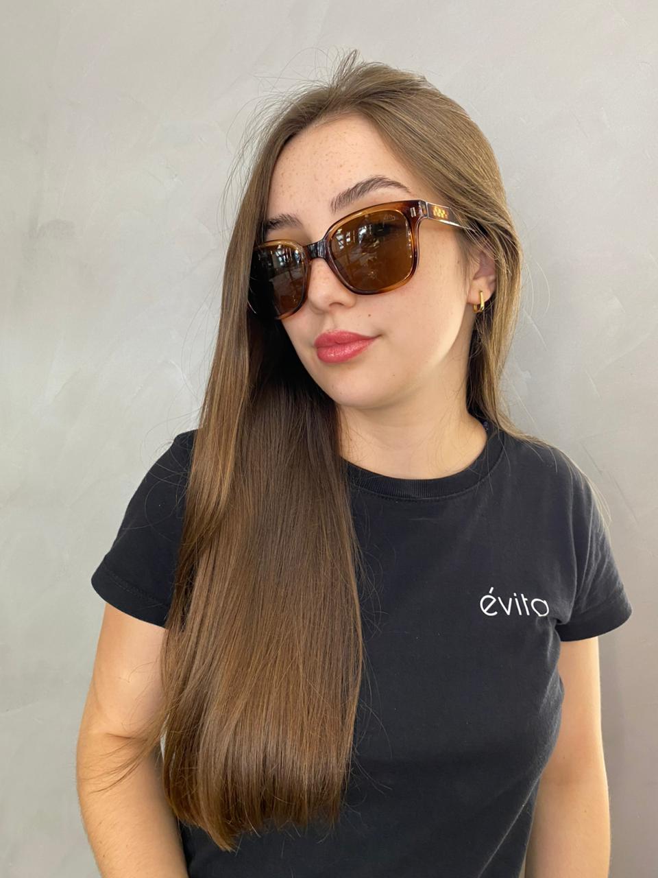 Elegante e versátil, esse óculos solar possui armação em acetato tartaruga em um tom mais claro, trazendo leveza e sofisticação ao visual.