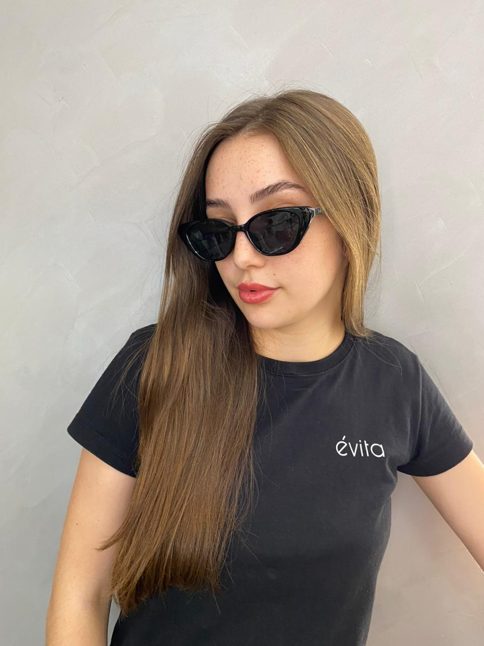 Moderno e cheio de atitude, esse óculos solar em formato gatinho possui armação preta com design delicado e lateral fina, garantindo um visual elegante e sofisticado.